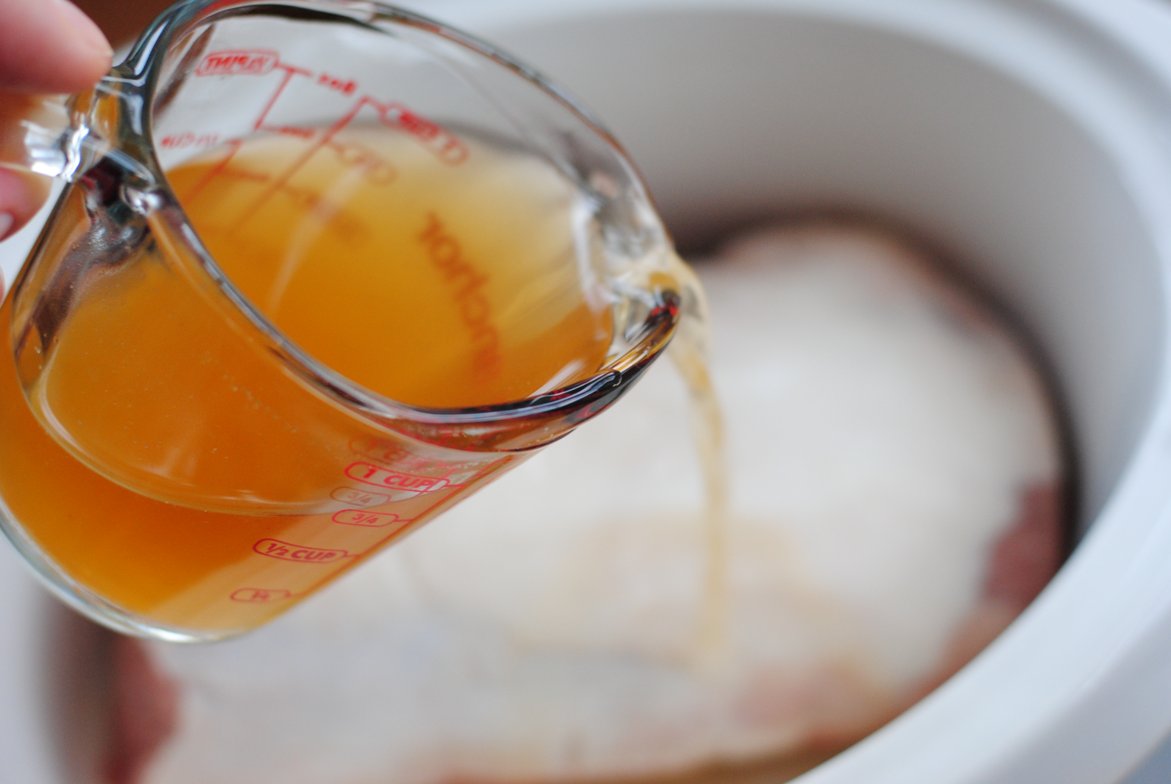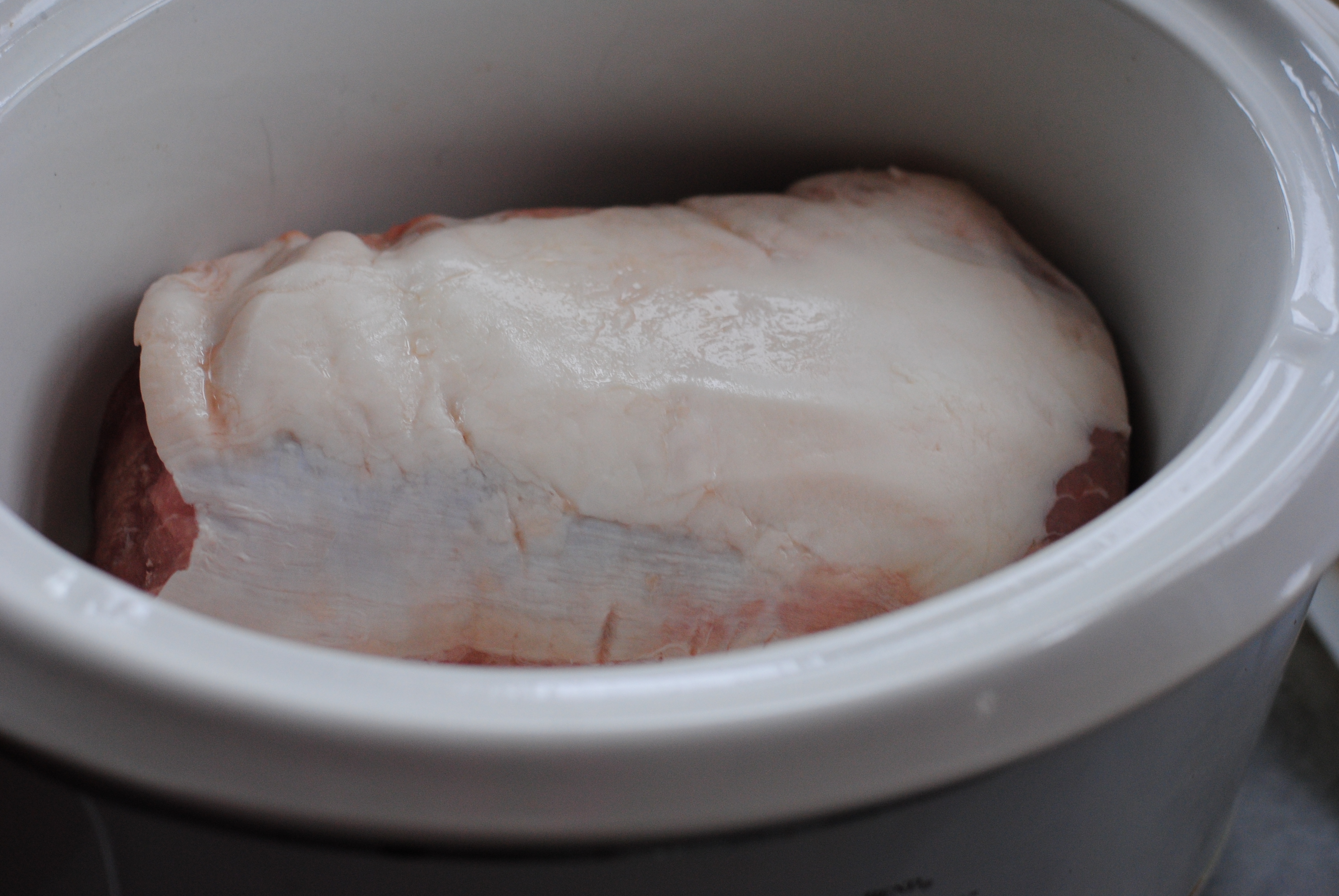 Turn your crock pot on low. I like to give it a good long time to cook so that the meat just falls apart. It makes it so tender and moist and really easy to shred. I put mine in around 8:30am and shredded it up around 4pm or so.