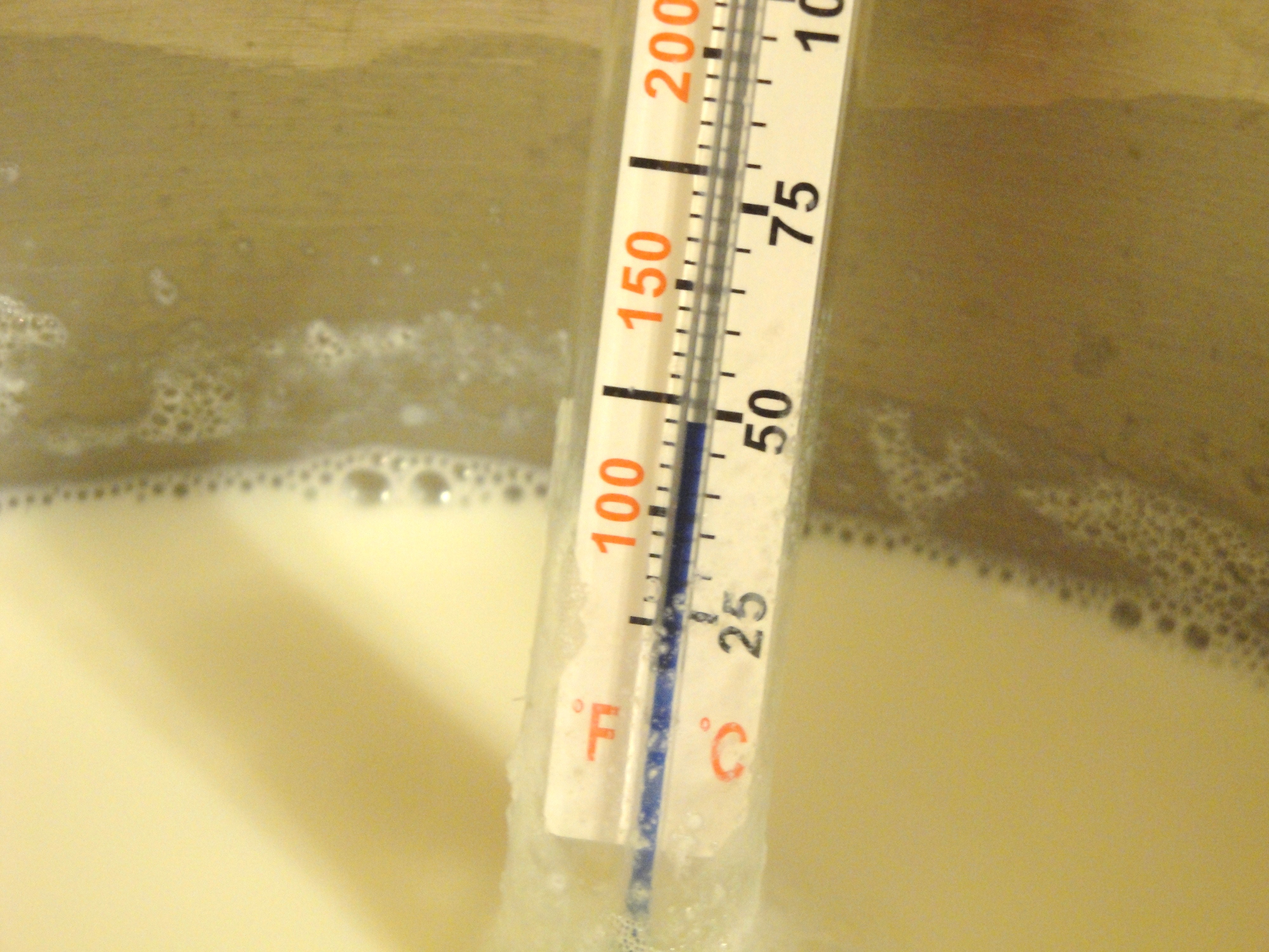 When the milk has cooled to 120 it’s time to stir in the live cultures.  I take a bit of my warm milk and mix it into the starter,