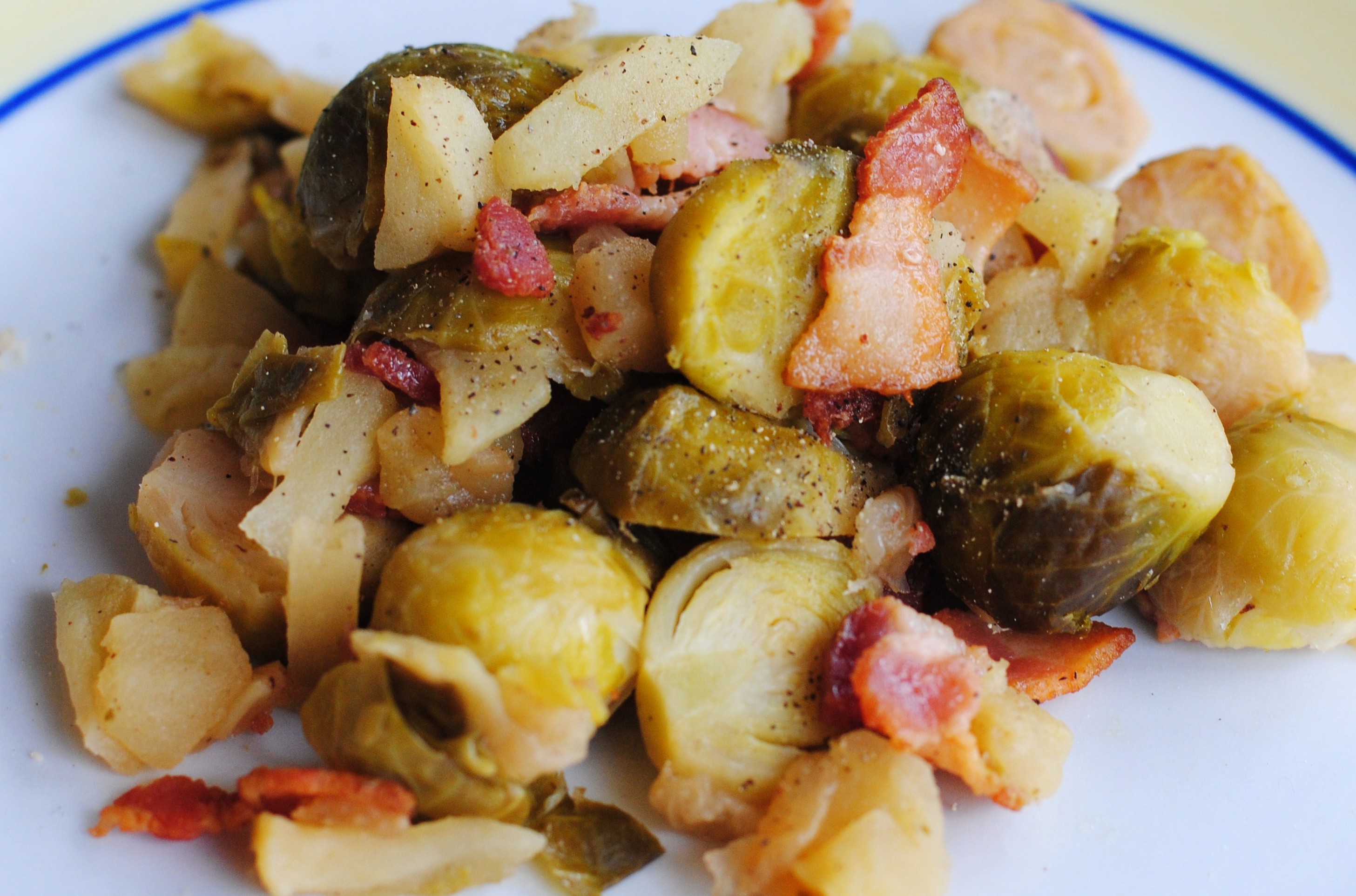 Cook bacon in skillet. Remove bacon, but leave grease in the skillet (ok, so this part isn’t totally healthy). Add the onion to the bacon grease and saute until tender. Add the brussel sprouts; cover and cook until tender, about 15-20 minutes, stirring every couple of minutes. Add the chopped apples and continue to cook until apples are the texture you prefer. If you prefer them softer, add them sooner in this process. Finish cooking and stir in bacon. Salt and pepper to taste, and serve.