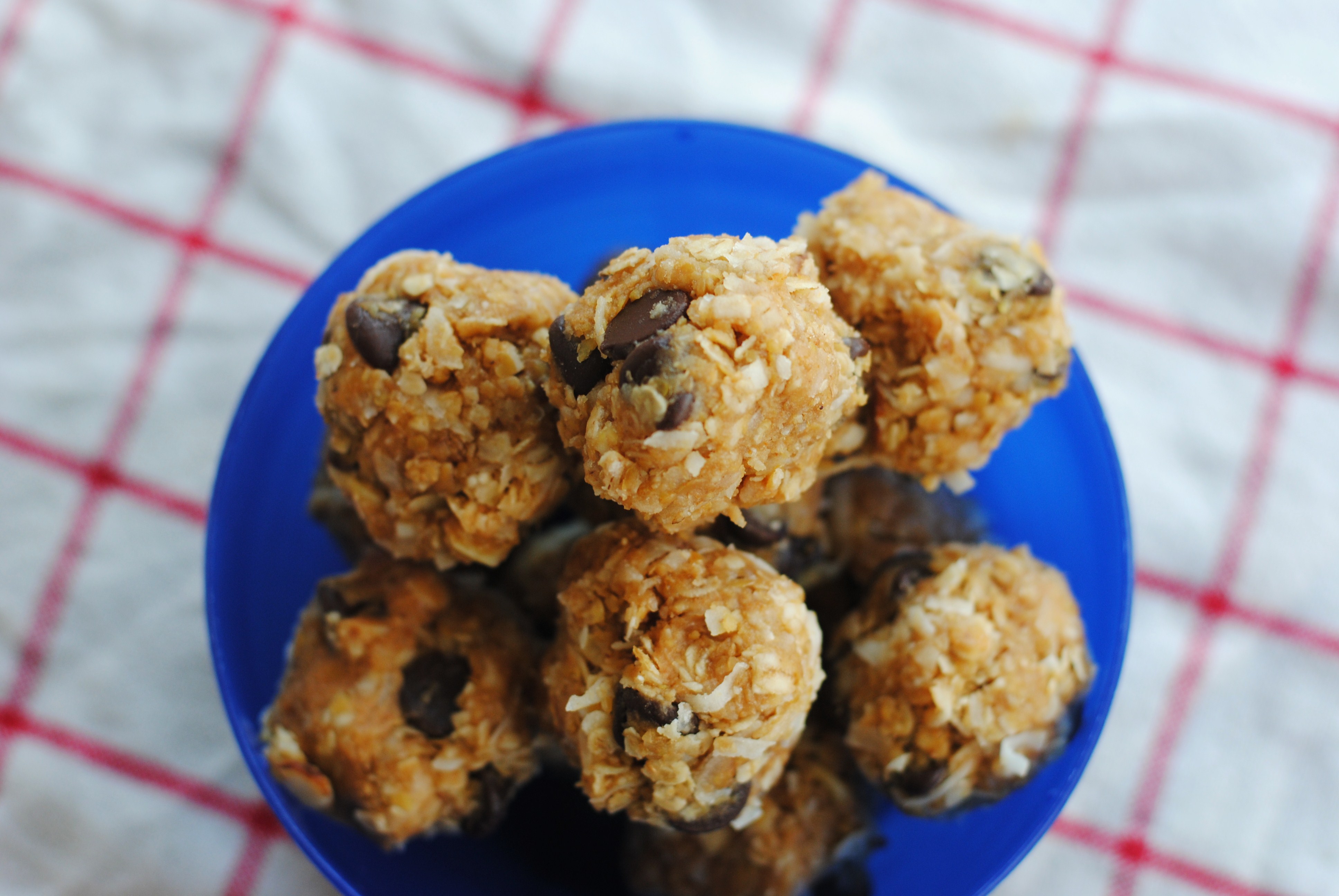 I first saw these on a blog somewhere (they have been circulating through various blogs and now Pinterest) and decided to make them mostly for the kids. I liked that there was protein in them and it seemed like they would be more filling than a lot of snacks like crackers or pretzels. I mixed them together, gave one a try and thought “these are WAY better than I expected!” They are really good. I also use them sometimes to satisfy a sweets or chocolate craving. Even one of these bites is decently filling. My kids usually eat 2-3 for a snack. I’m sure as they get older that amount will increase. 🙂