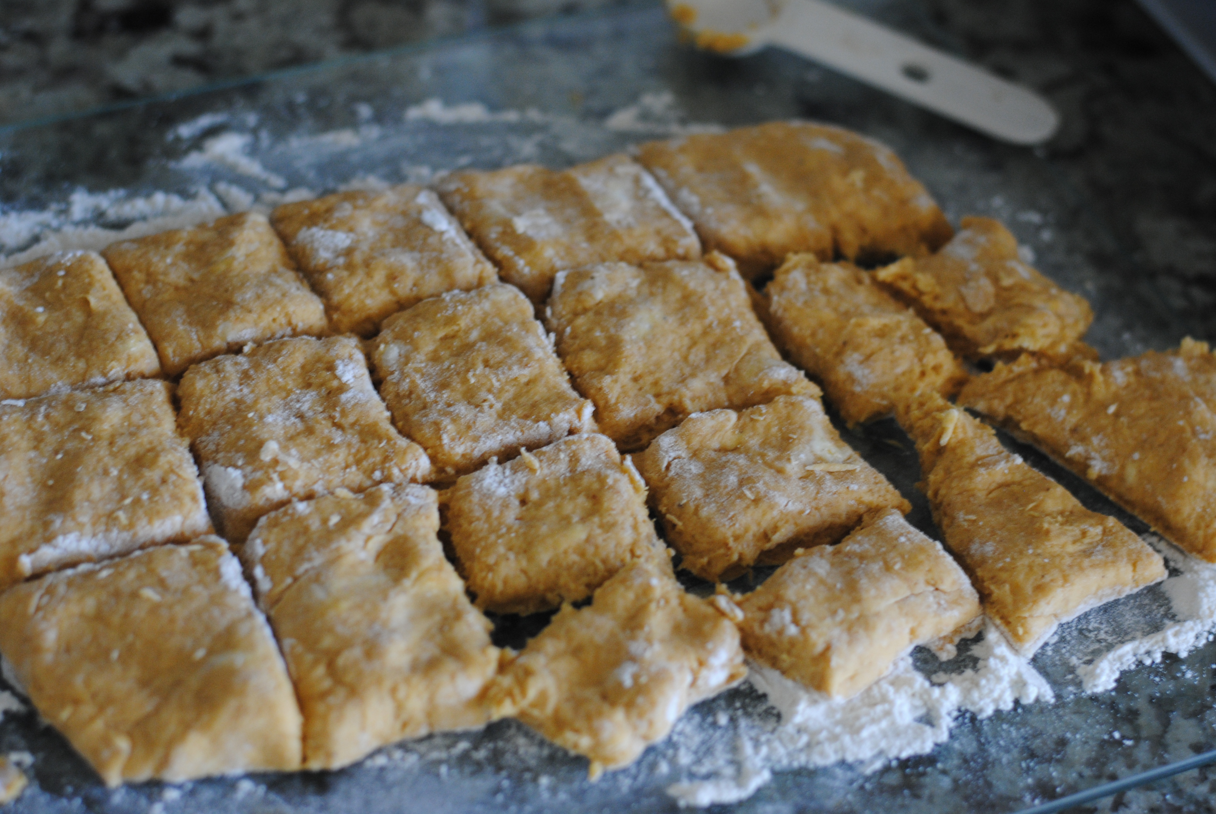 Pat out dough onto a lightly floured surface and form into a rectangle.  Cut into 2″ squares or shape desired.  Place on prepared baking sheet.  Bake for 9-10 minutes or until they look done.  Place on a wire rack to cool.