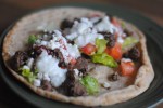 Layer on pita or flatbread, meat and toppings. I prefer flatbread over pita because it is softer and I like its texture better. However, I found this great option – Joseph’s Pita Bread, which is more like a flat bread than pita. I used the Flax Oat Bran and Whole Wheat and they were delicious. They have other varieties as well. I found these at Walmart, so they are probably sold at a lot of stores. (This can be made gluten free by using that type of wrap or flat bread)
