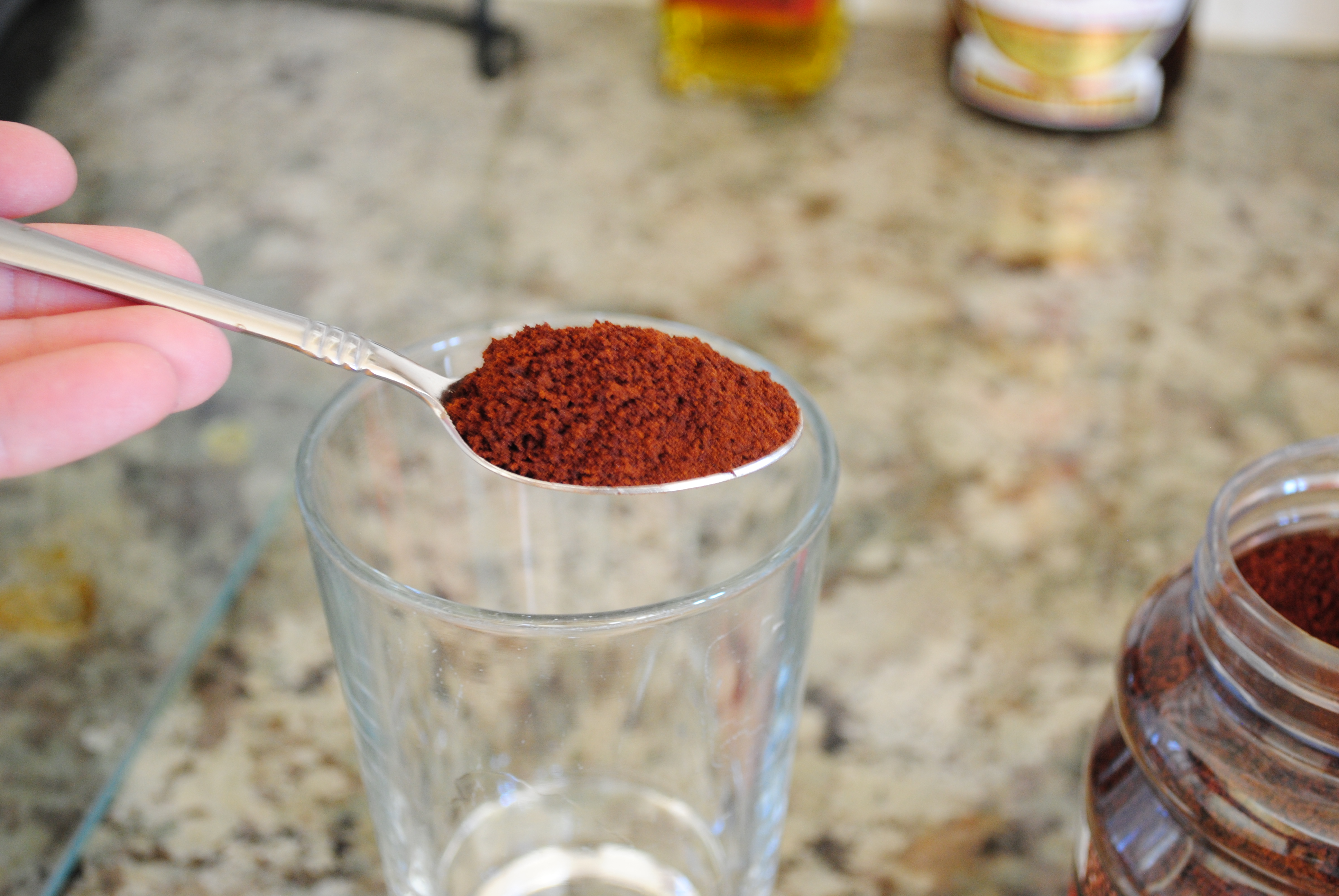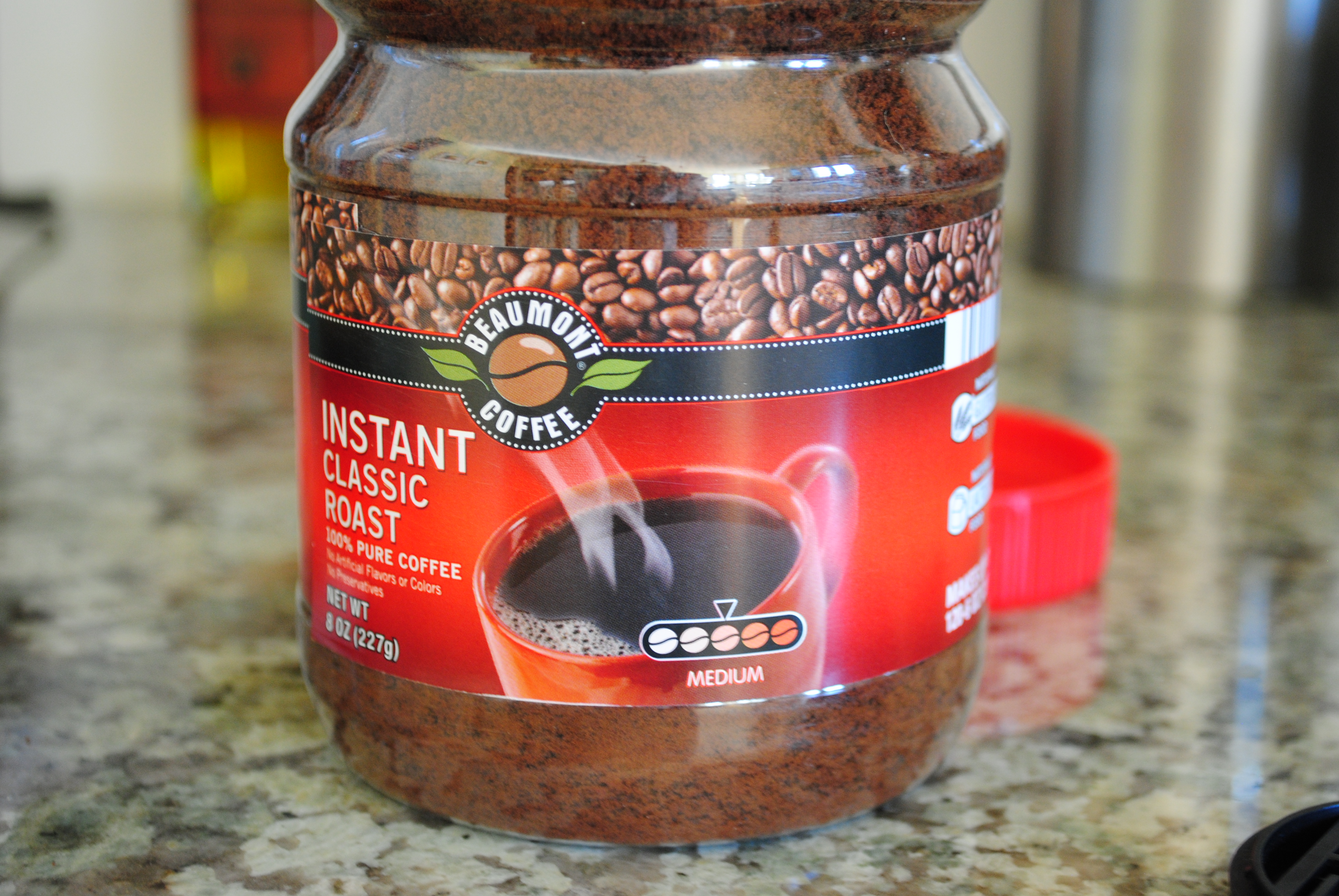 Next take a scoop of instant coffee and dump it into the water. Give it a stir until the coffee is dissolved. Any kind of instant coffee seems to work. This is Aldi’s brand. I have to admit, I was a bit skeptical when I heard this started with instant coffee, but I was soon a believer!