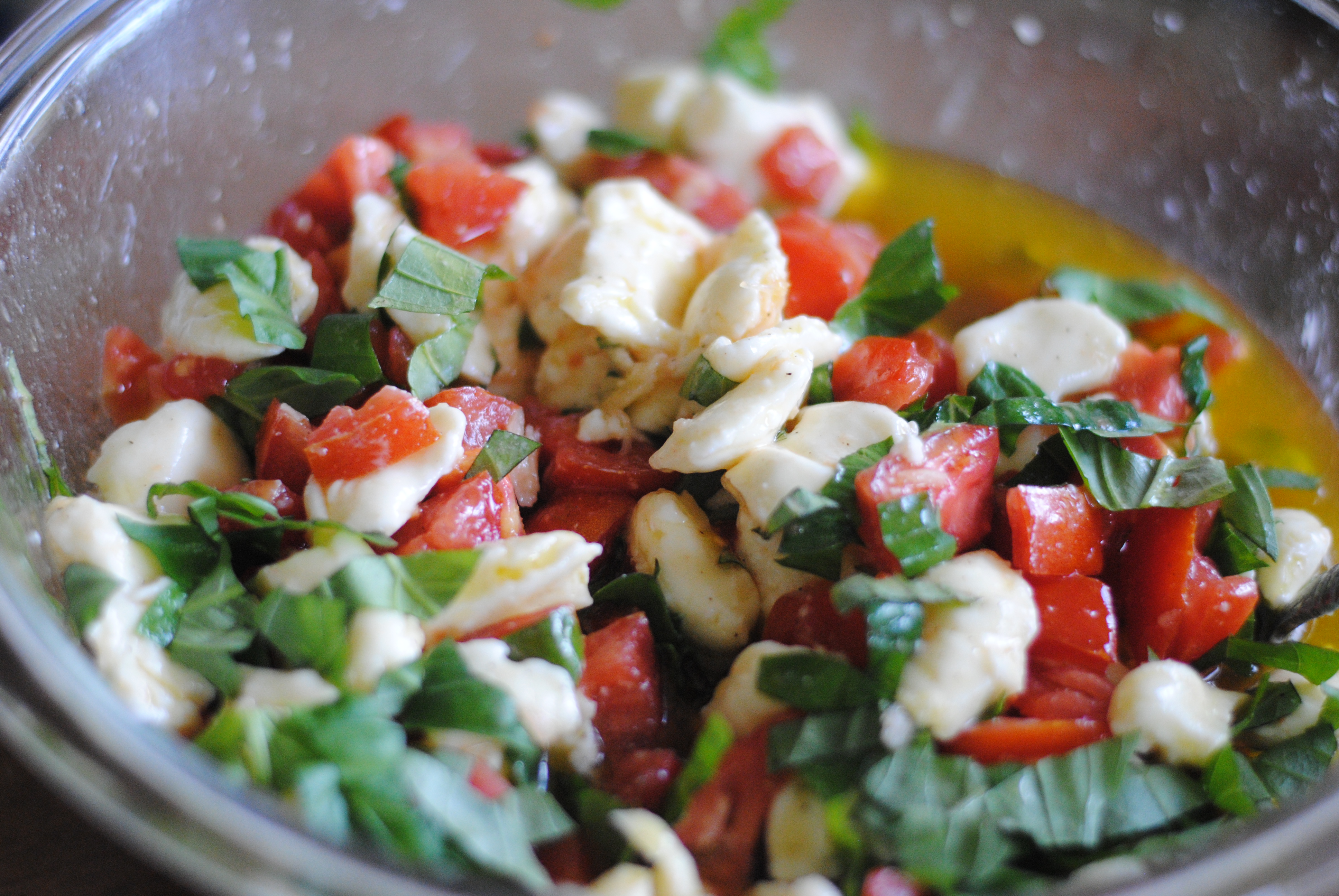 Start by dicing tomatoes, garlic, fresh basil and brie into a bowl. Add the olive oil. Let sit at least 2 hours. I usually let mine sit for longer. You can put it in the refrigerator and let it sit all day, especially if you are at work. Let it come to room temperature before adding it to the pasta.