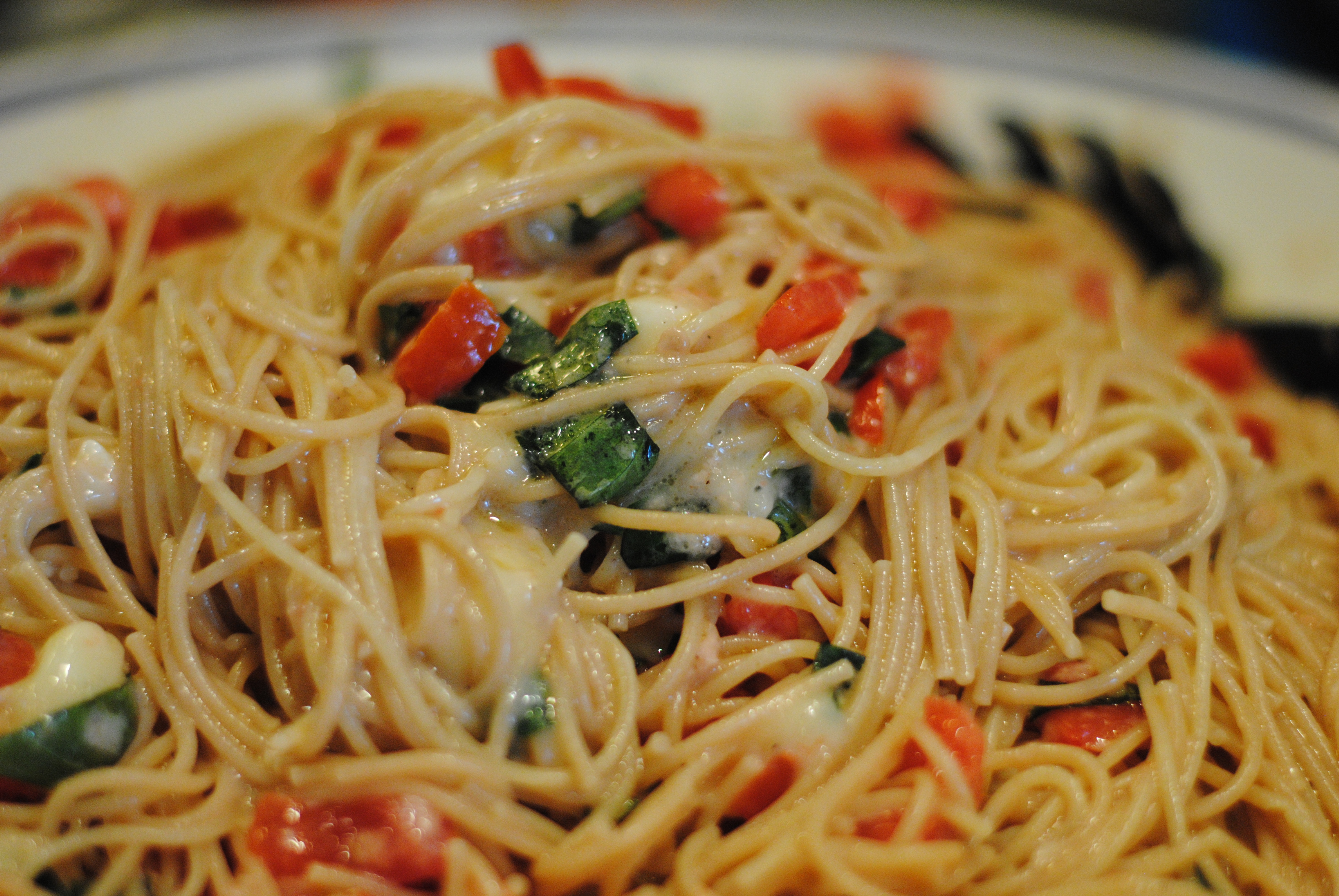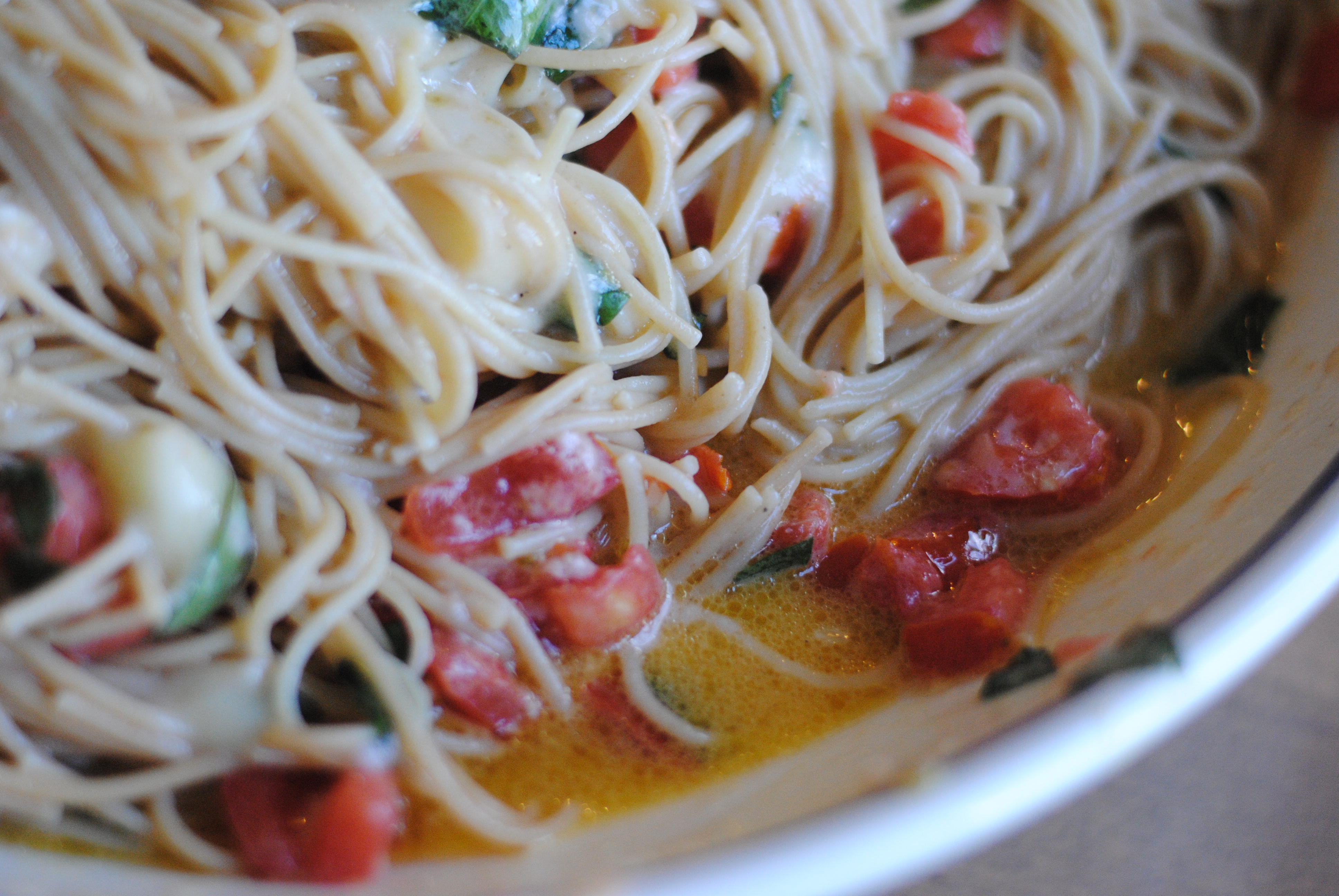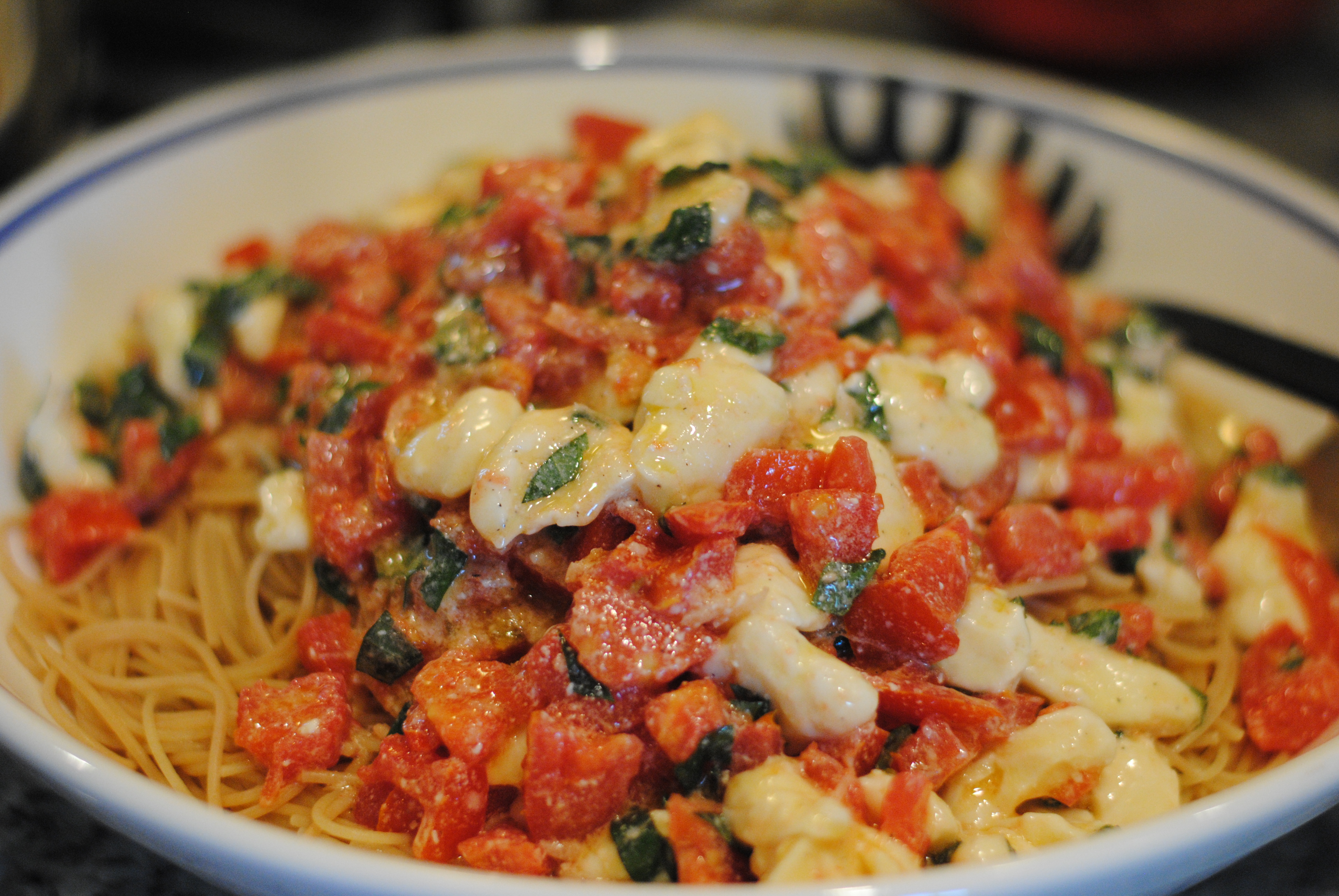 Because it’s August and because it’s tomato season, one of the greatest times of the year, I wanted to post this fabulous pasta dish. It is.to.die.for. It tastes like something you could get in a restaurant. Of course it’s best when you can use lovely, fresh, local tomatoes. And fresh basil. Which is also growing like crazy right now. August is such a delicious produce month – tomatoes, basil, peaches, corn, blueberries – oh my.