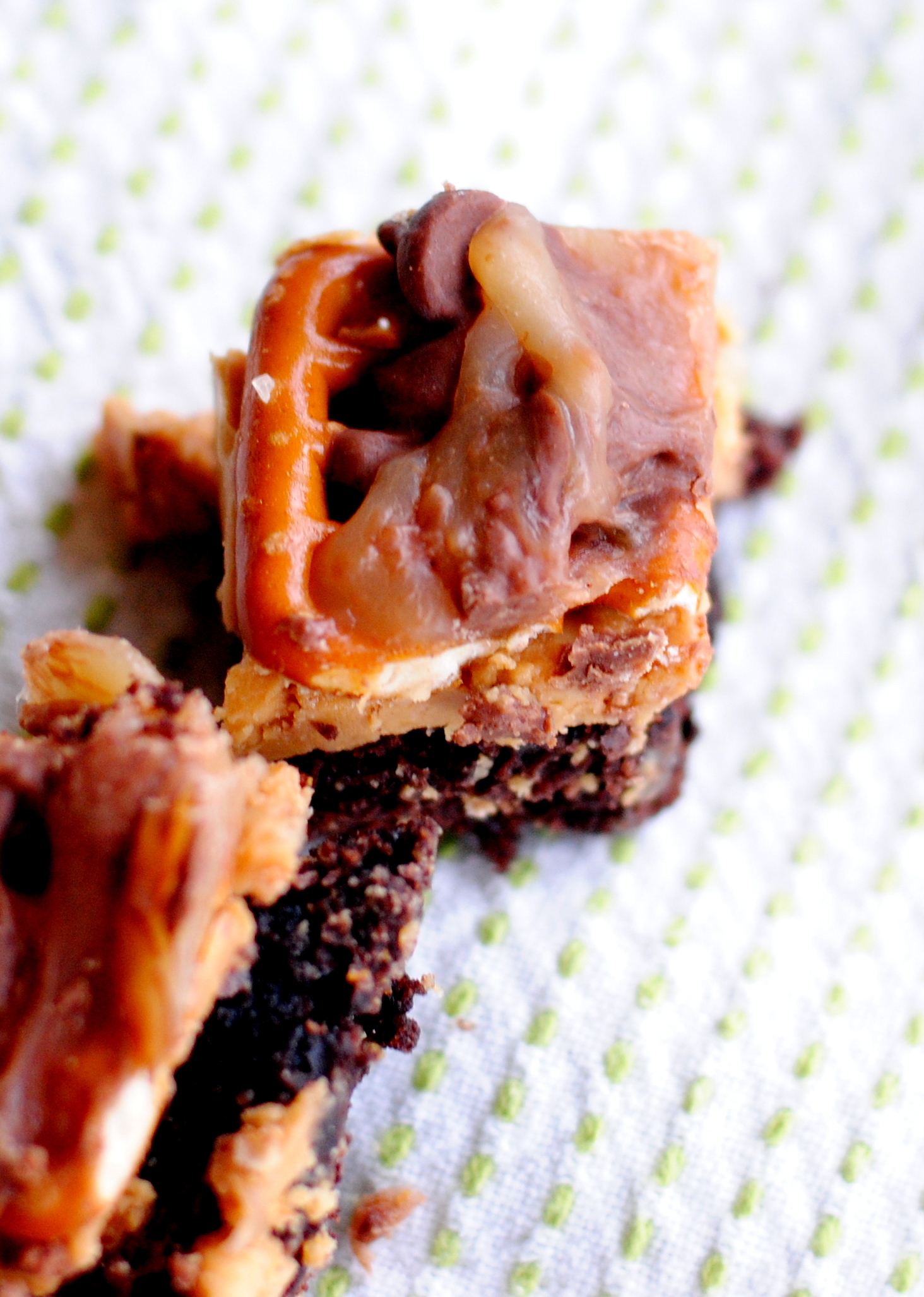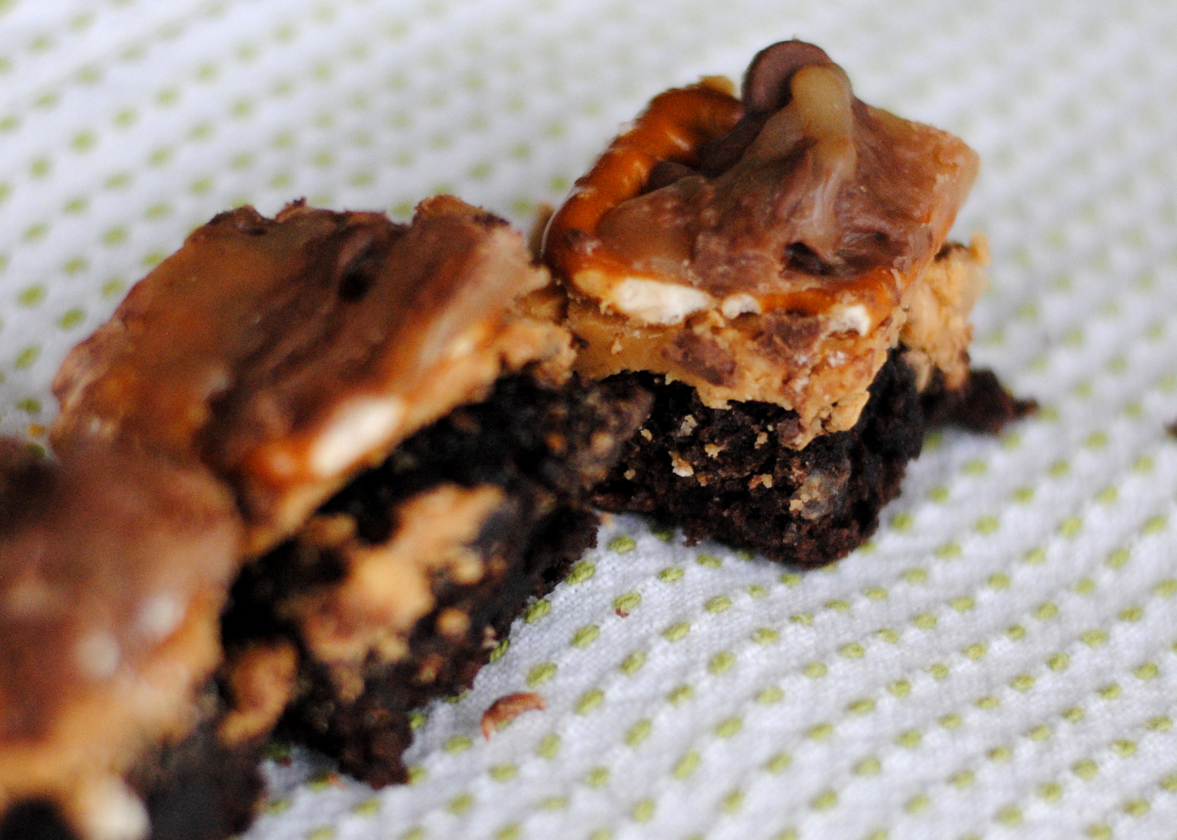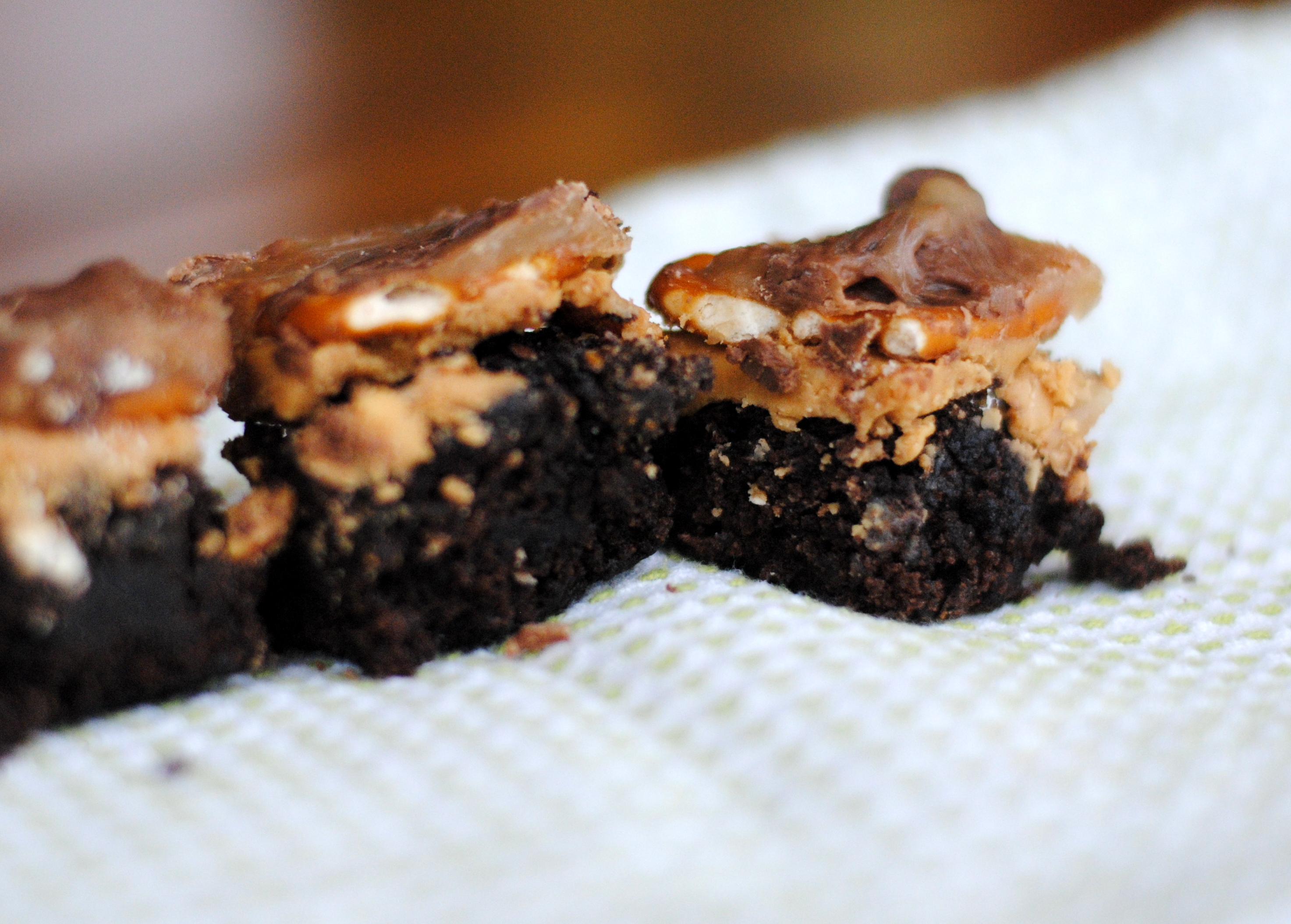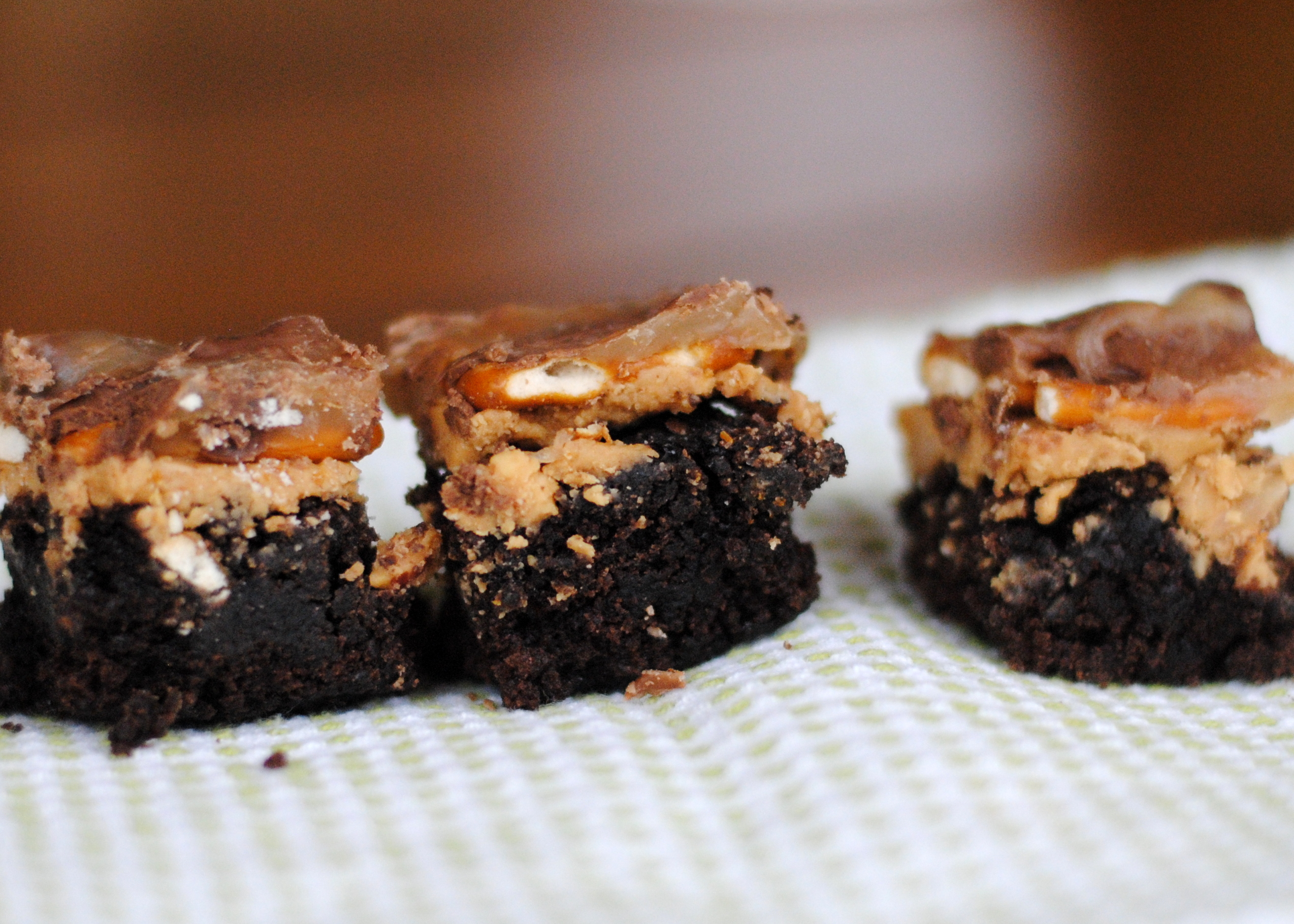 These brownies are an imitation of the wonderful candy bar Take 5. I’m pretty sure they will be well received wherever they go. I recently made them for a baby shower that I hosted for my dear friend Anne. The ladies at that shower definitely had good things to say! However, Mr. Chaos wasn’t that impressed with them. I was worried that maybe I had lost my taste buds, but I double checked and no, everyone agreed that these brownies are divine. So now I’m just worried that I’m married to a slightly insane person.