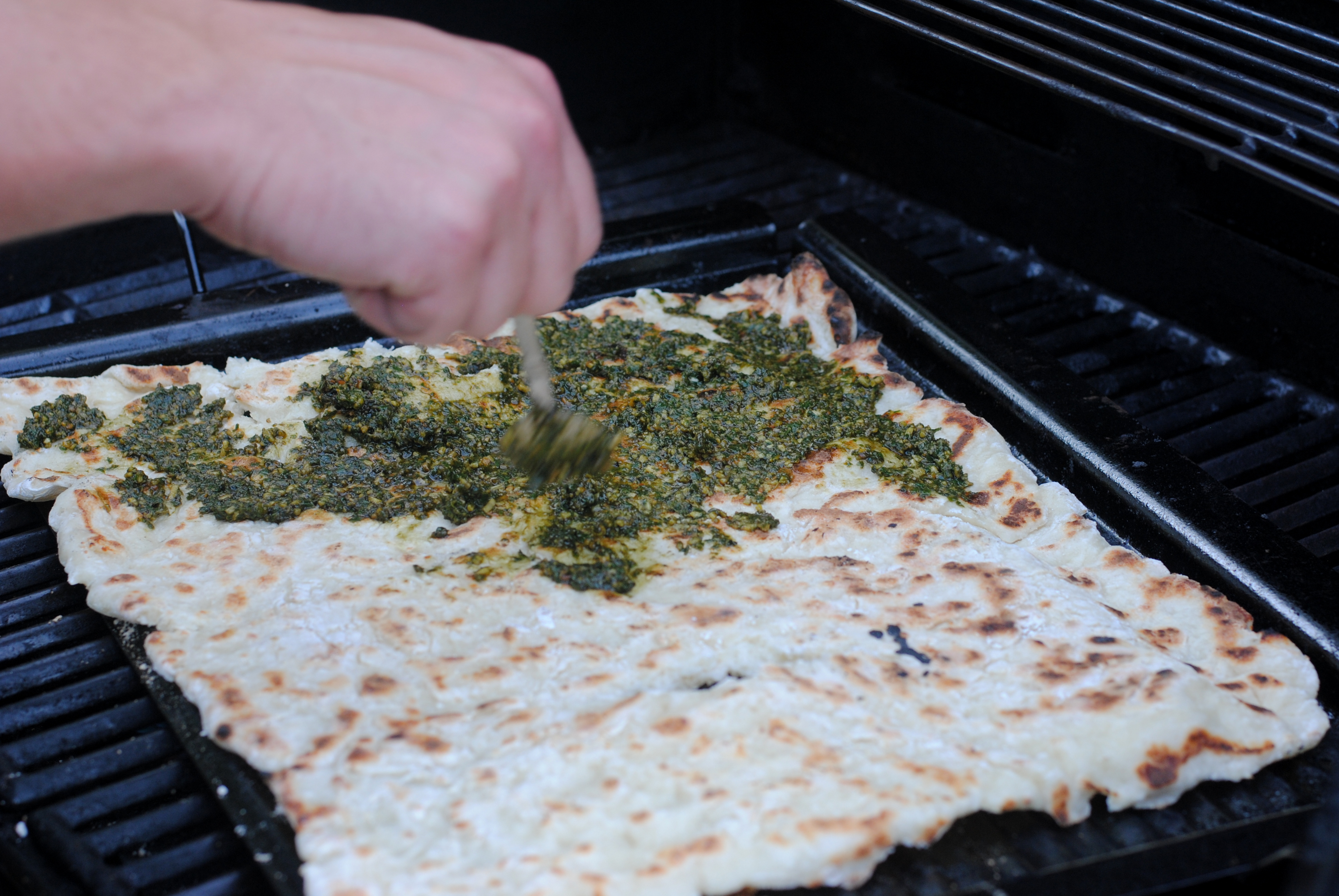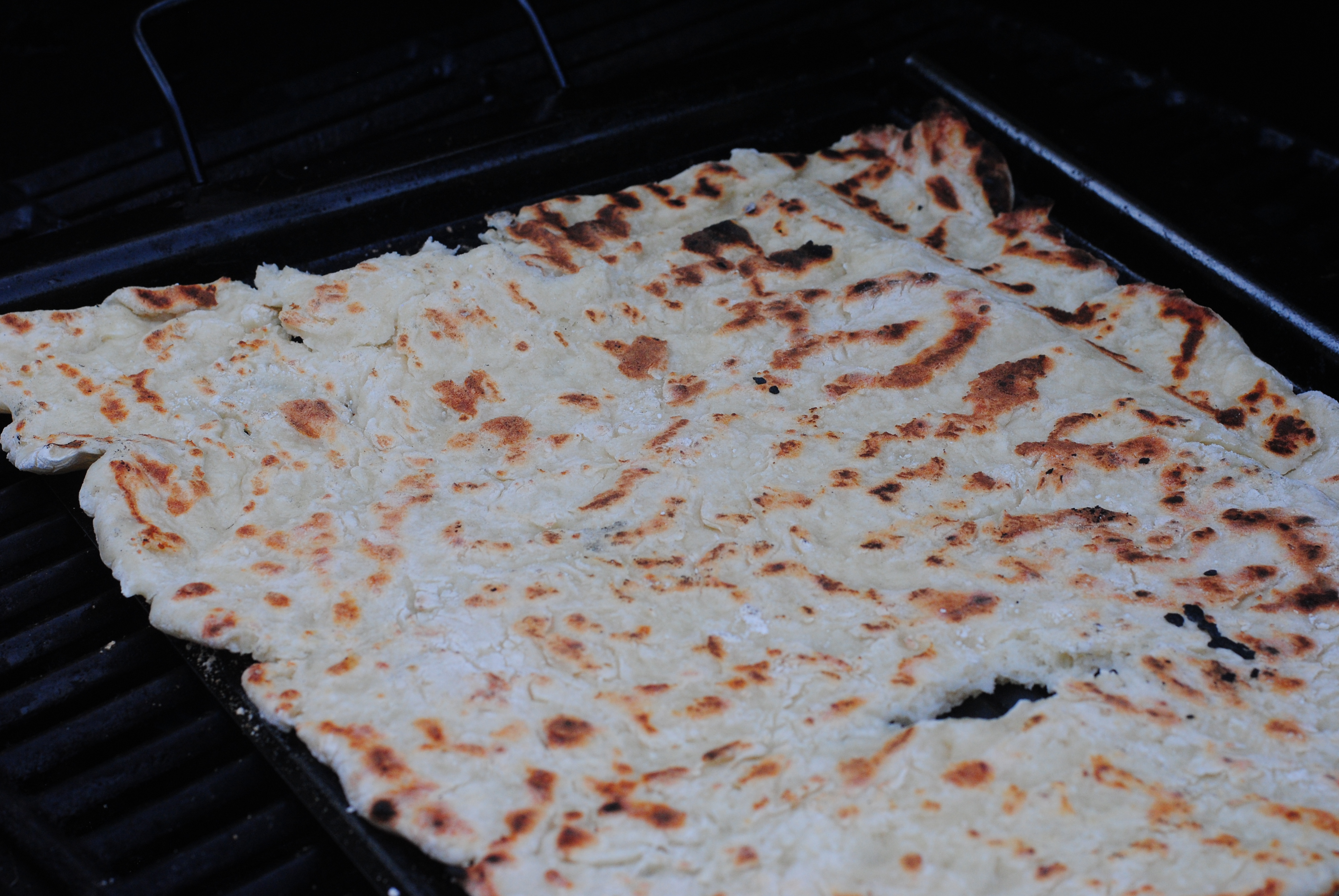 To make the pizza, preheat your grill to 400-500 degrees. You want it good and hot. We rub some oil on our grill first, I’ve heard some people don’t, but I’ve never tried that. We have a grill pan that has holes in it and works great. I’ve read that people often do it directly on the grill – I’m guessing the dough couldn’t be too thin or it would slip between the grill bars. You will get better each time you place the dough on the grill :). Close the grill lid and let it bake for several minutes, check it to make sure it doesn’t burn! Carefully flip it over, we use tongs. Here is a picture after the dough has been flipped. Look at the wonderful crust!!