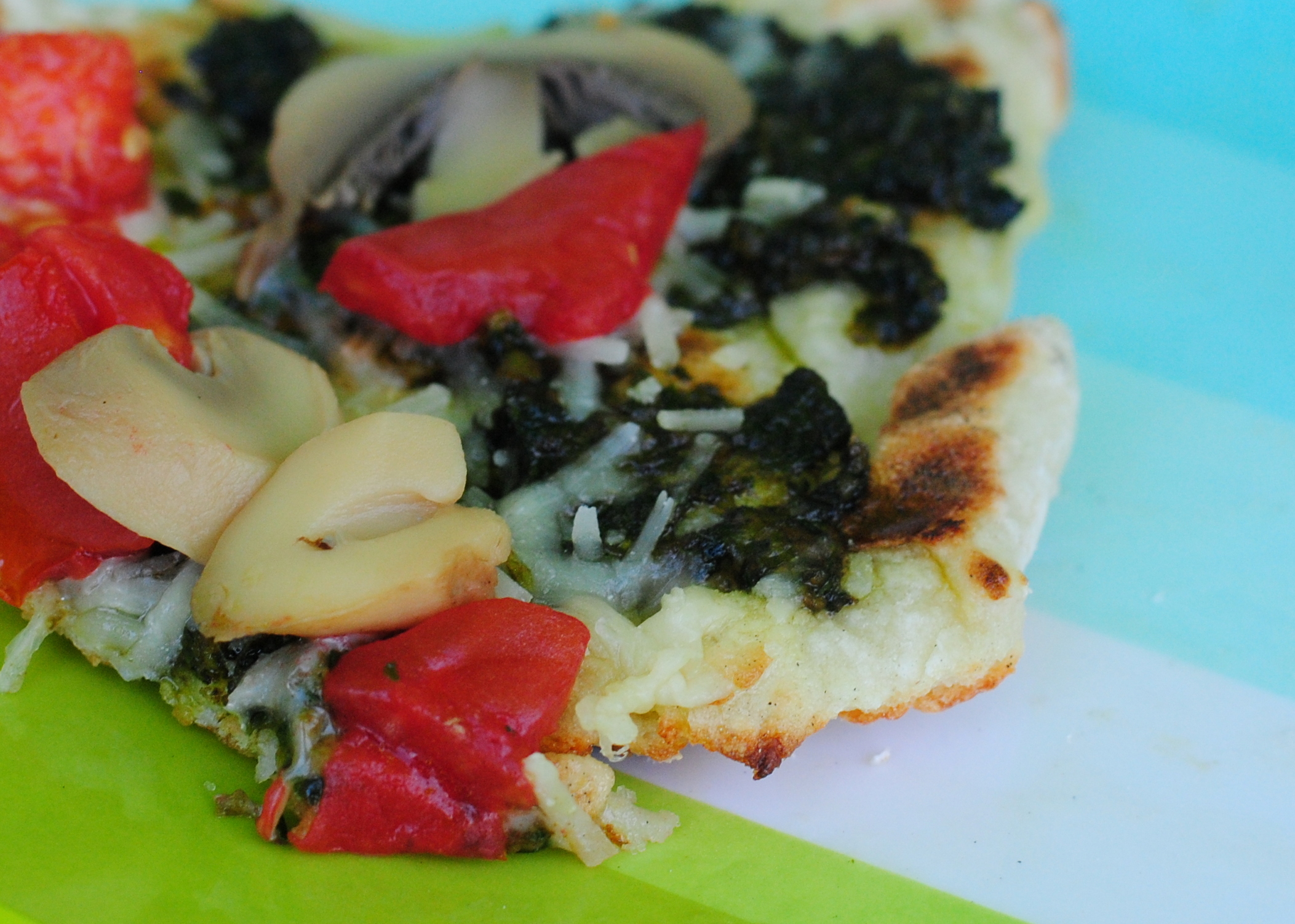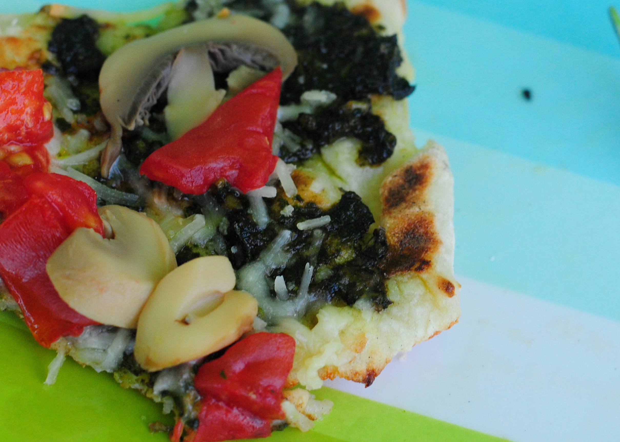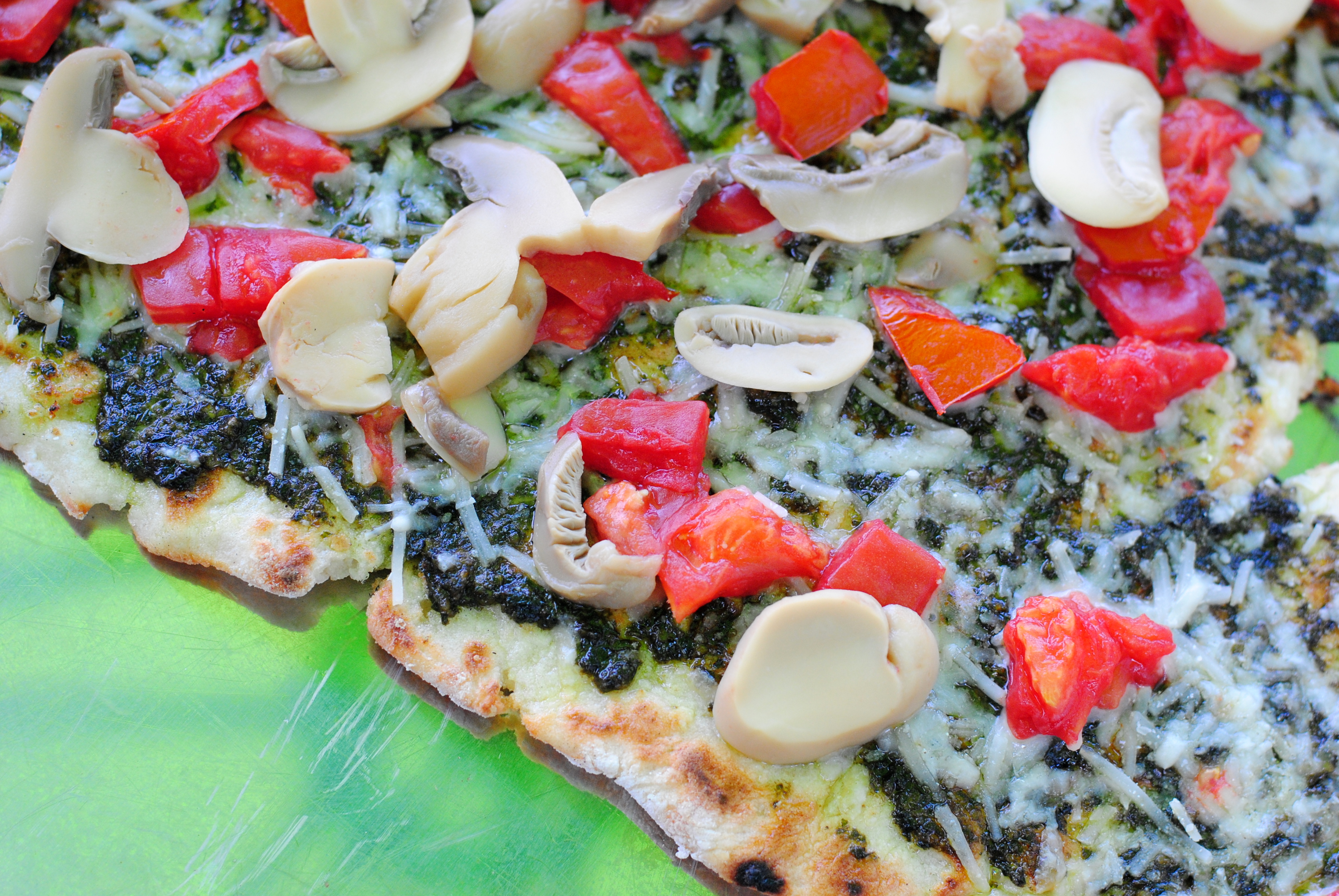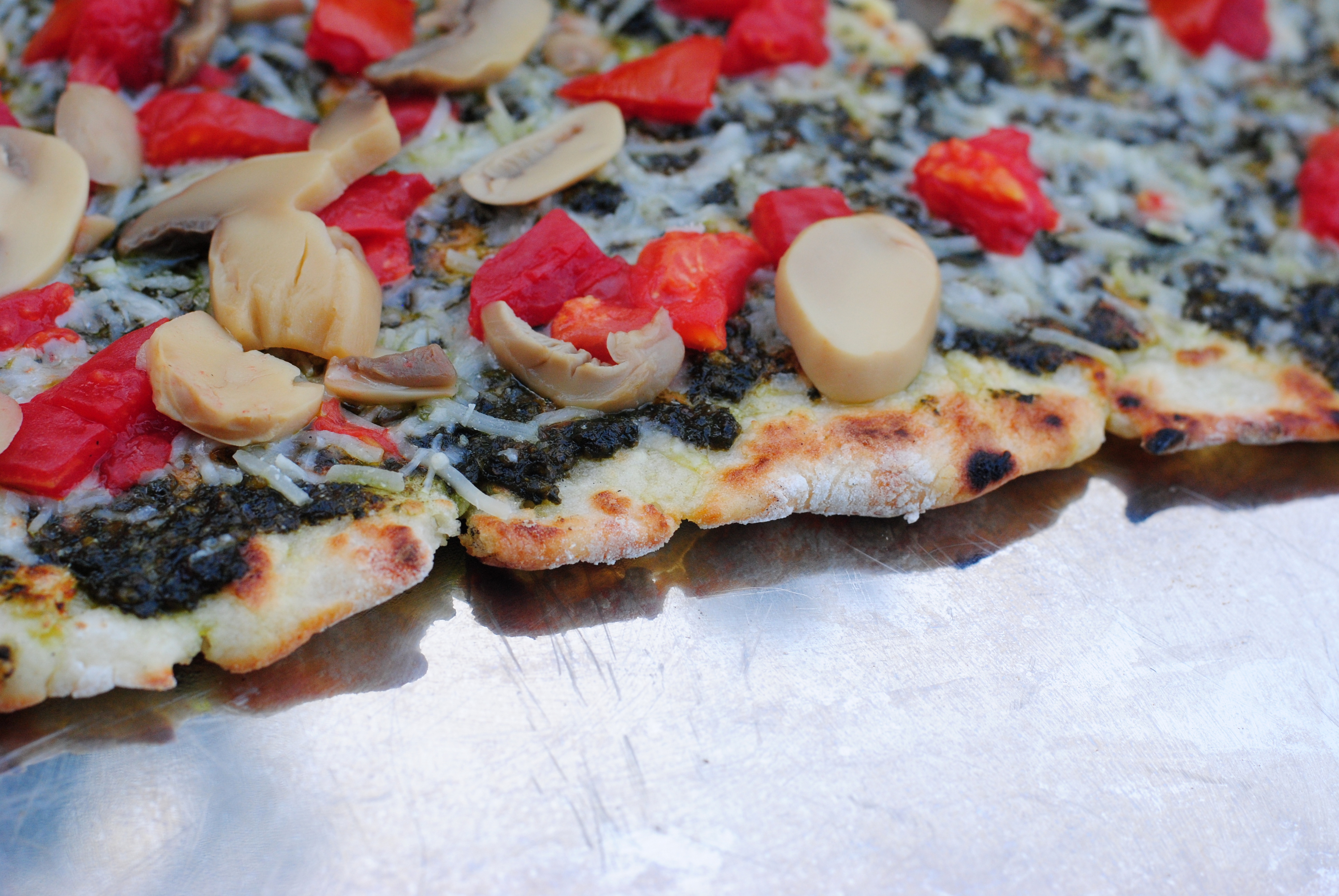Then quickly add sauce and toppings. This pizza we made with pesto, mushrooms, Parmesan cheese and fresh tomatoes. Mr. Chaos is doing a great job of spreading pesto :).