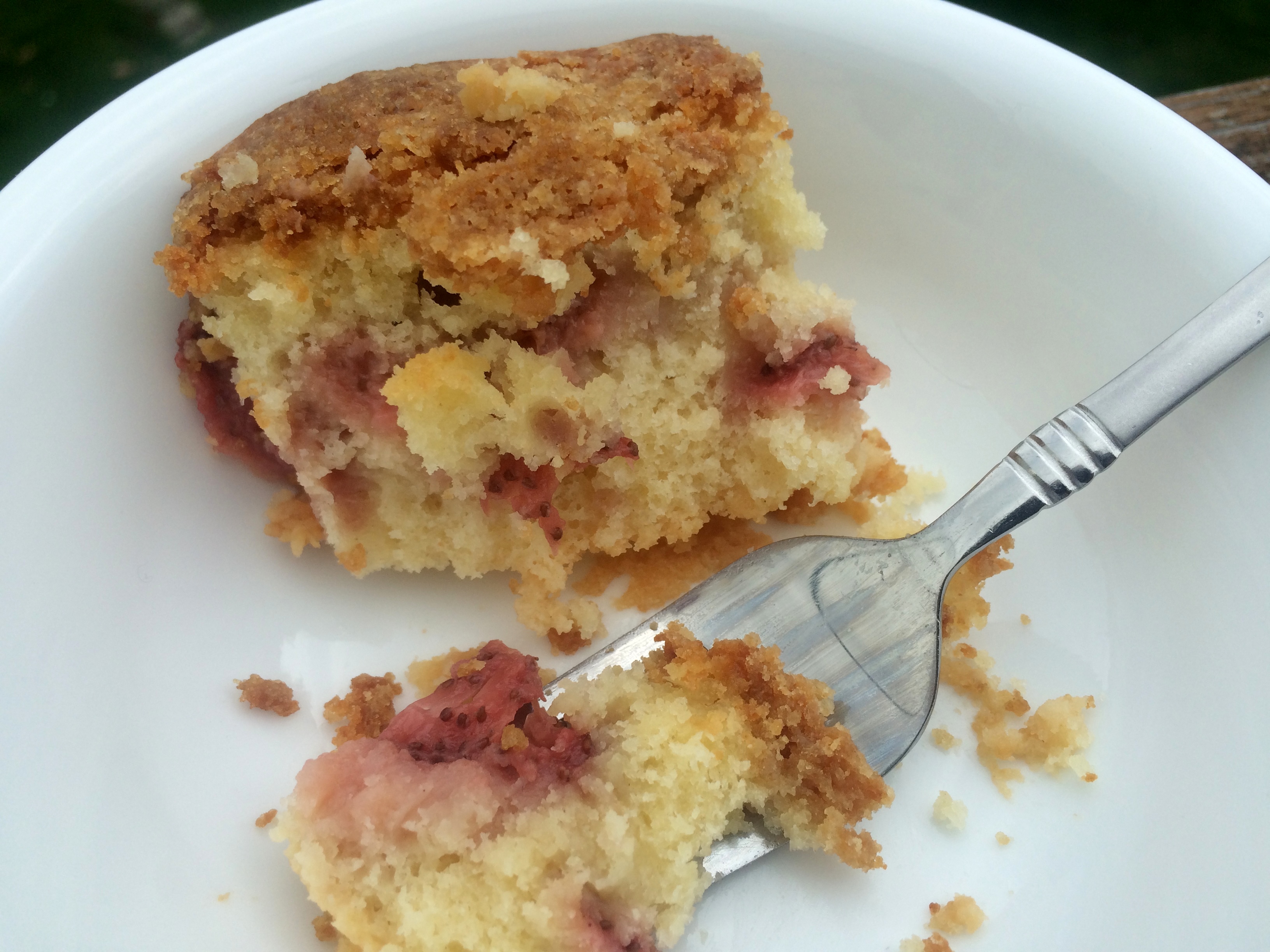 Beat butter with mixer and gradually add sugar, mixing well. Add egg and vanilla and continue to mix thoroughly. Combine flour, baking powder and salt in a separate bowl. Add flour mixture alternatively with milk, beginning and ending with flour. Spoon half of batter into greased 8×8 square baking pan. Spread strawberries across batter, cover with remaining batter.